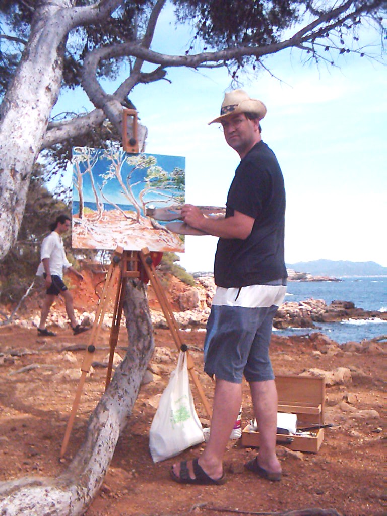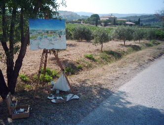 Für den Fall, dass es windig ist, muss die Staffelei an einem Baum festgebunden oder mit Einkaufstüten voller Steine beschwert werden - ein halber Quadratmeter Leinwand kann bei Mistral schon einen ordentlichen Druck aufbauen. Zwischendurch kann dann auch auf der Terrasse weitergearbeitet werden, aber alle Schritte werden nachher am Originalmotiv kontrolliert.